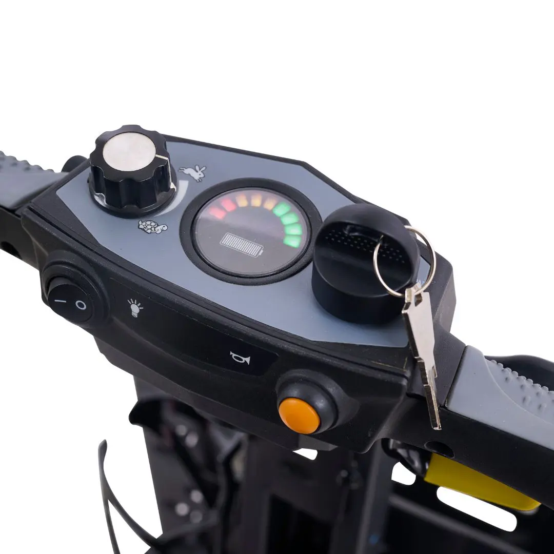 - Airline-friendly scooter with removable lithium-ion batteries that can be taken on planes, trains, or cruises