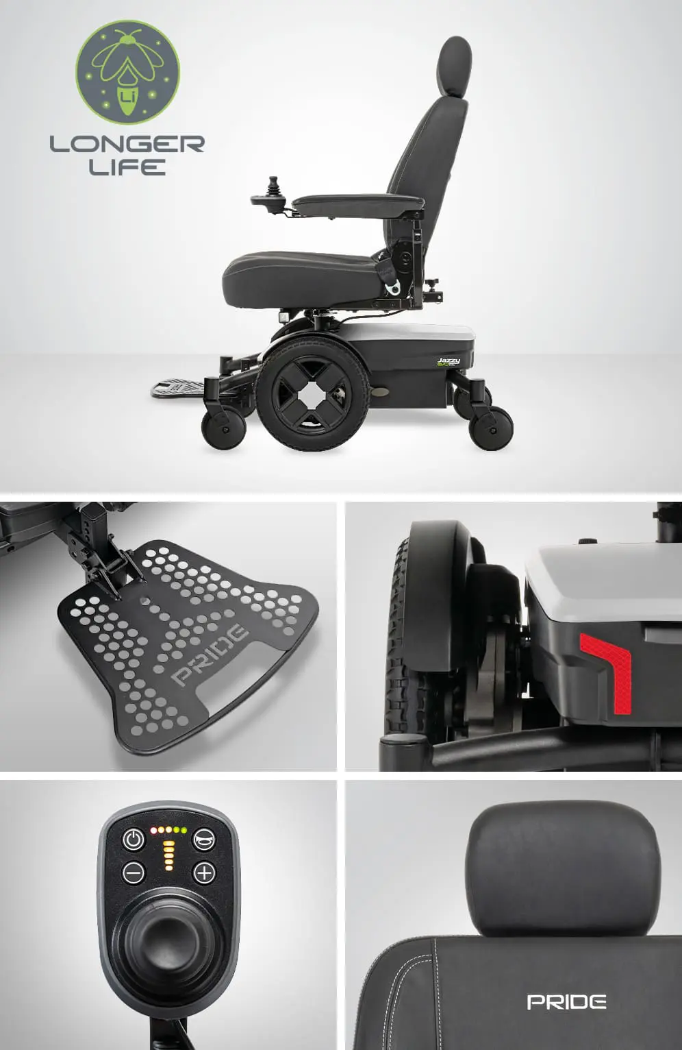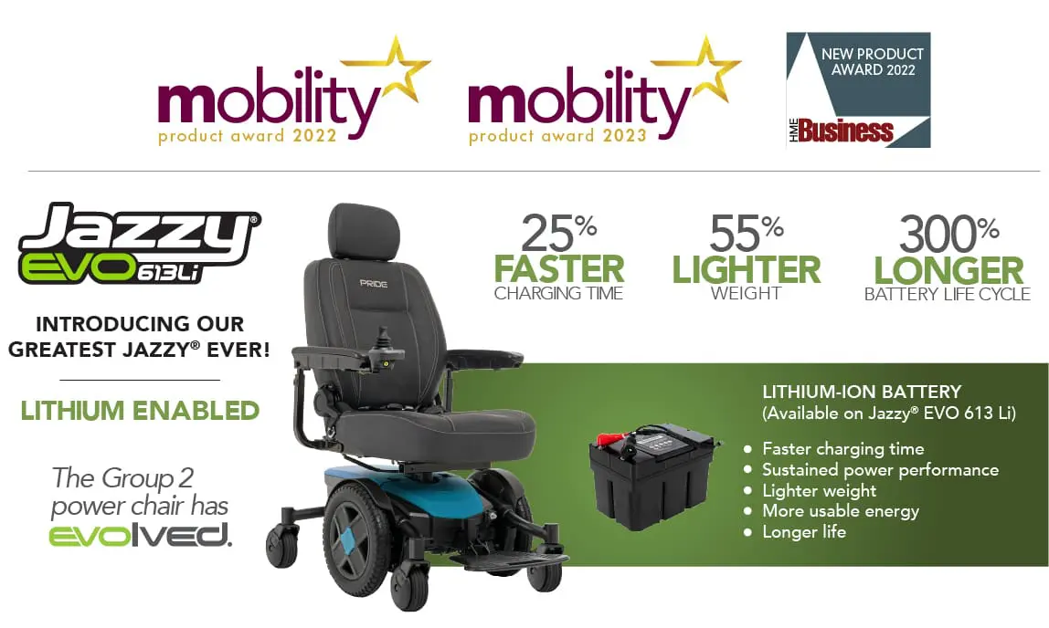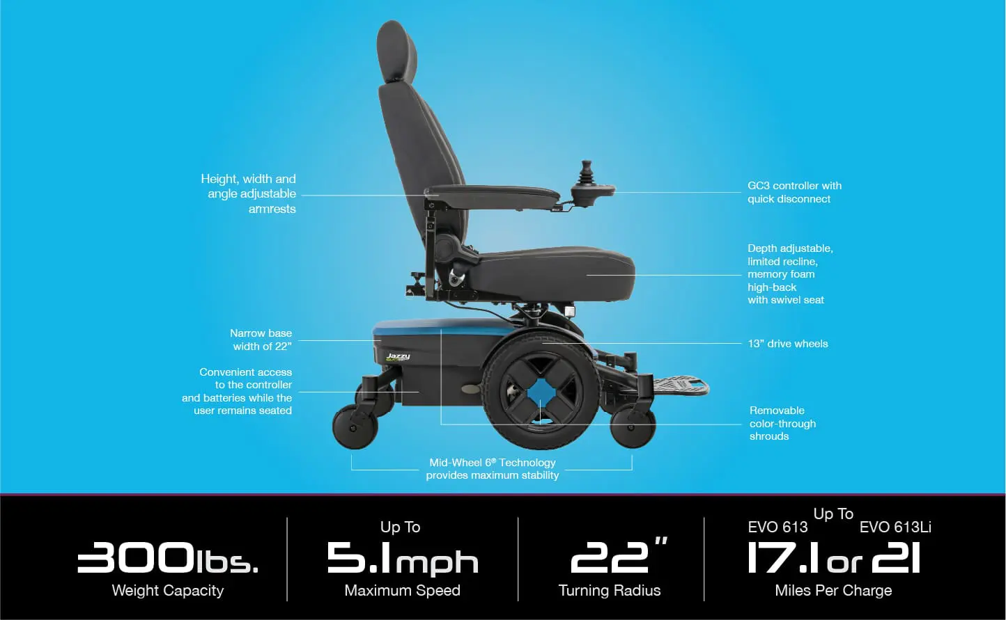 The Jazzy® EVO 613 and Jazzy® EVO 613Li measure in at an impressive 22 inches wide at the base and offer a 22-inch turning radius. Not only is it one of the most powerful power wheelchairs on the market, but it’s also one of the narrowest and most maneuverable.