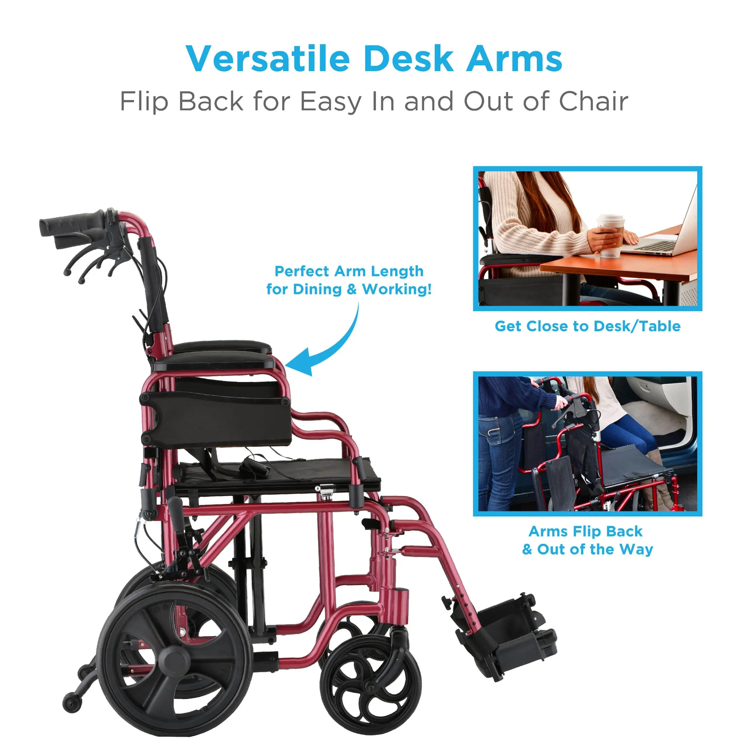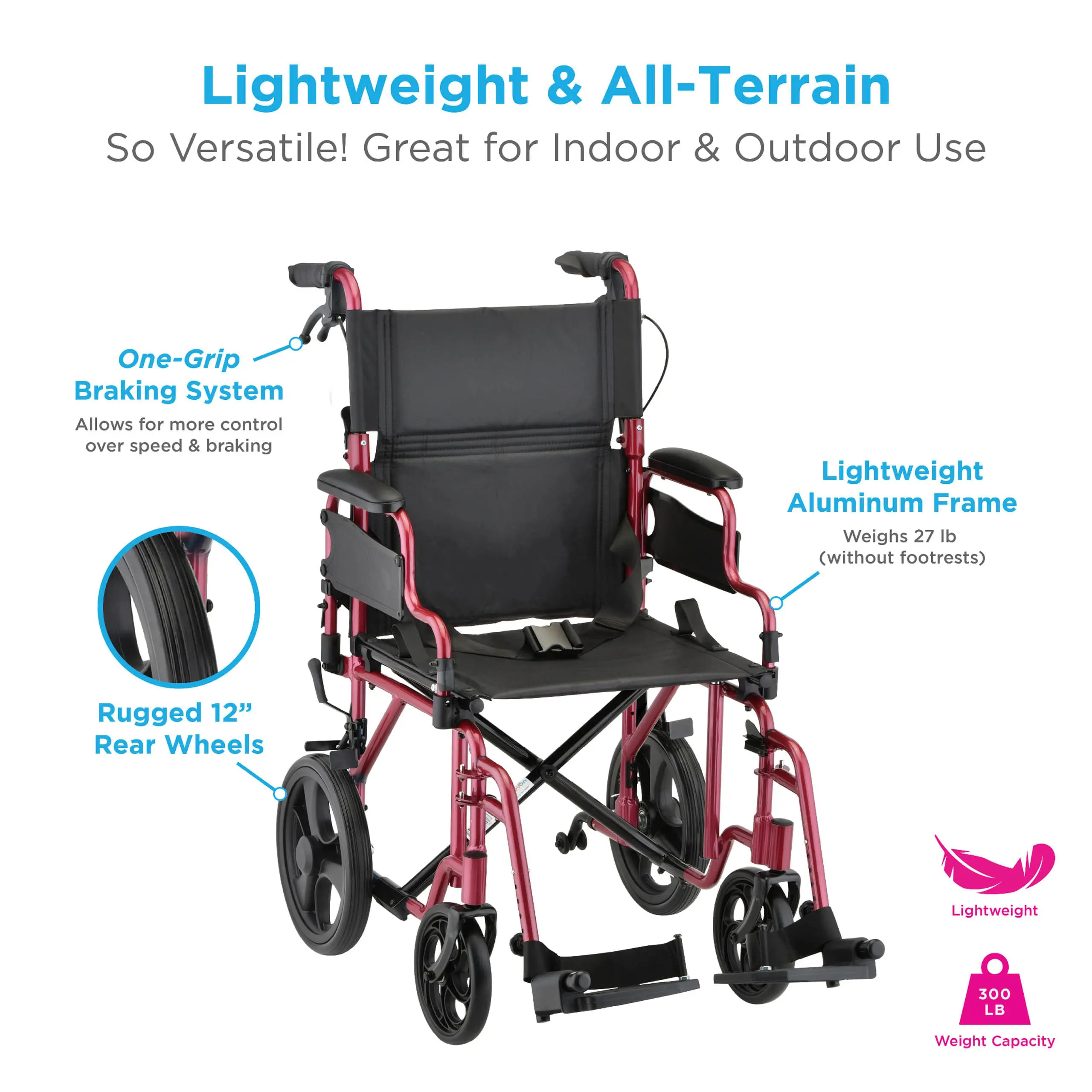 We love the 353 Transport Chair because it’s lightweight, yet versatile and all-terrain, with One-Grip locking handbrakes, flip-up desk arms, rugged rear 12” wheels and anti-tippers.